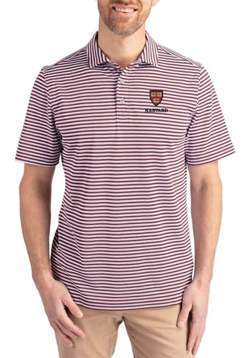 Mens Harvard Crimson Maroon Cutter and Buck Virtue Eco Pique Stripe Short Sleeve Polo Shirt